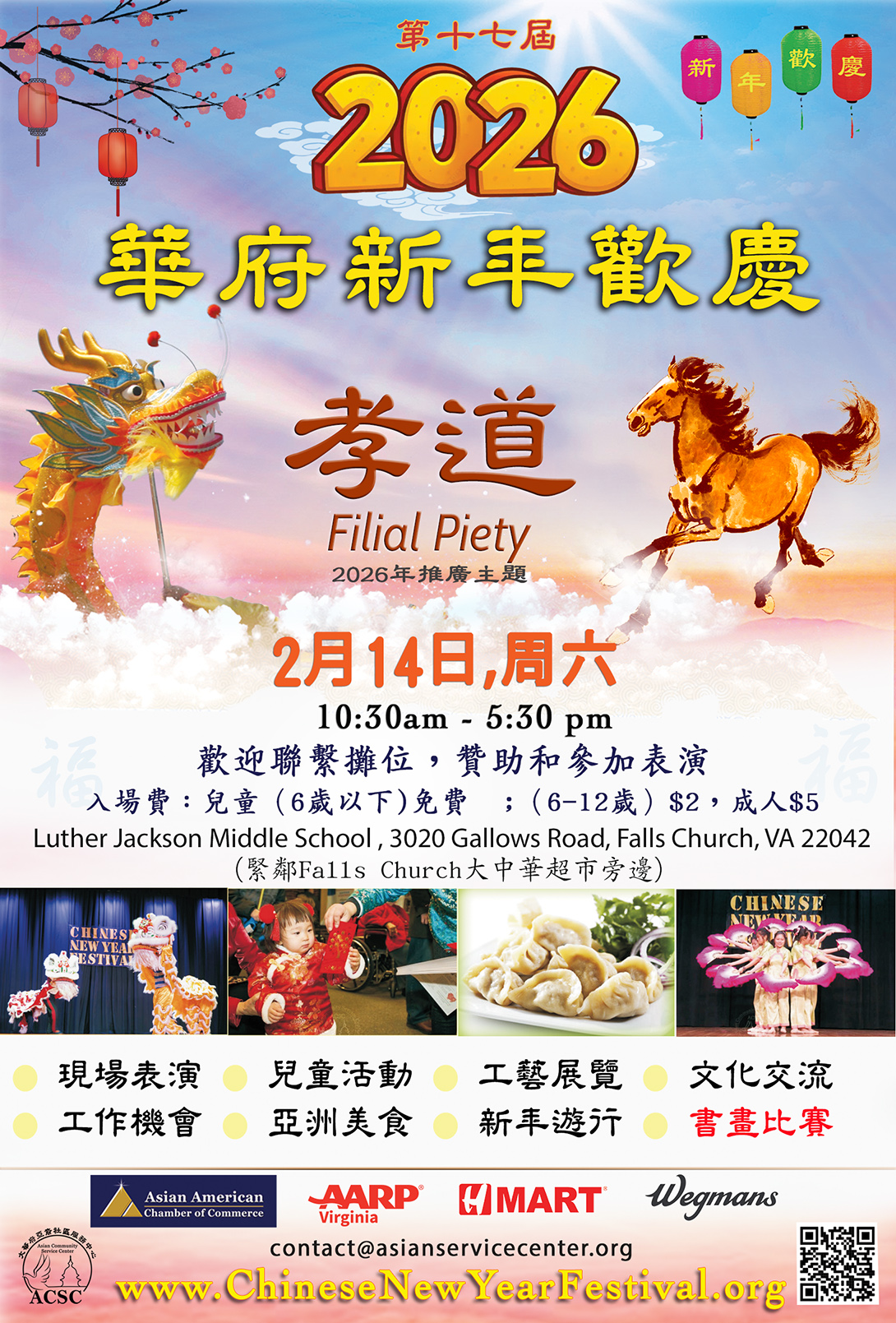 Chinese New Year Festival in the Washington DC metropolitan area is sponsored by Asian Community Service Center (ACSC) annually. ACSC is a volunteer-based independent non-profit organization in DC area (and anyone is welcome to join ACSC). Currently, ACSC volunteers are mostly Chinese Americans who have been living in the United States for many years. We hope that our children will keep in their memory the cultural roots and traditions of the Chinese New Year when they grow up. In addition, DC area is a culturally diverse community, and various celebrations from other cultures have motivated us to share the essence of Chinese culture with the local community. We would like children from all over the world to have an opportunity to experience the unique aspects of Chinese culture and traditions of five thousand years. Every year we promote a theme around the traditional Chinese values. The Chinese New Year is also the time for the entire family to gather together and give each other blessings to start a new year. We sincerely extend our invitation to all DC area residents to celebrate the Chinese New Year with us, to return to the traditions and to embrace a bright future.