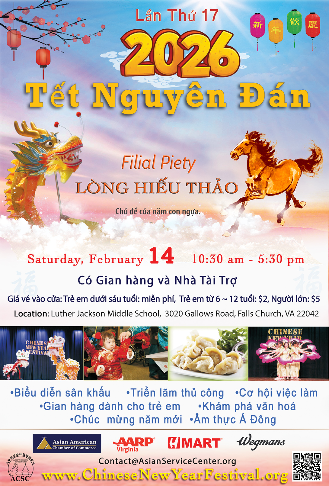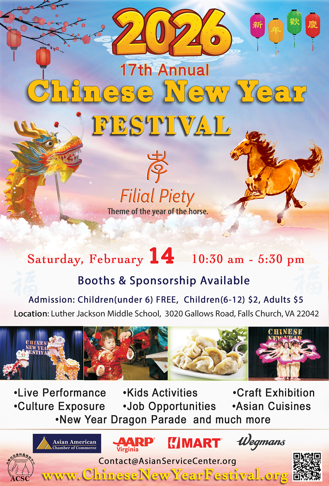 Chinese New Year Festival in Washington DC area is host by Asian Community Service Center (ACSC) annually. Usually it is one day in-door events with cultural performances including dragon and lion dances, delicious Asian foods, New Year Parade, Culture exhibition, Craft show, language, health and business booths, and children’s activities, among other attractions. We encourage you to wear Asian costume or your traditional costume to share with our community. The mission of our event is: Return to Tradition.